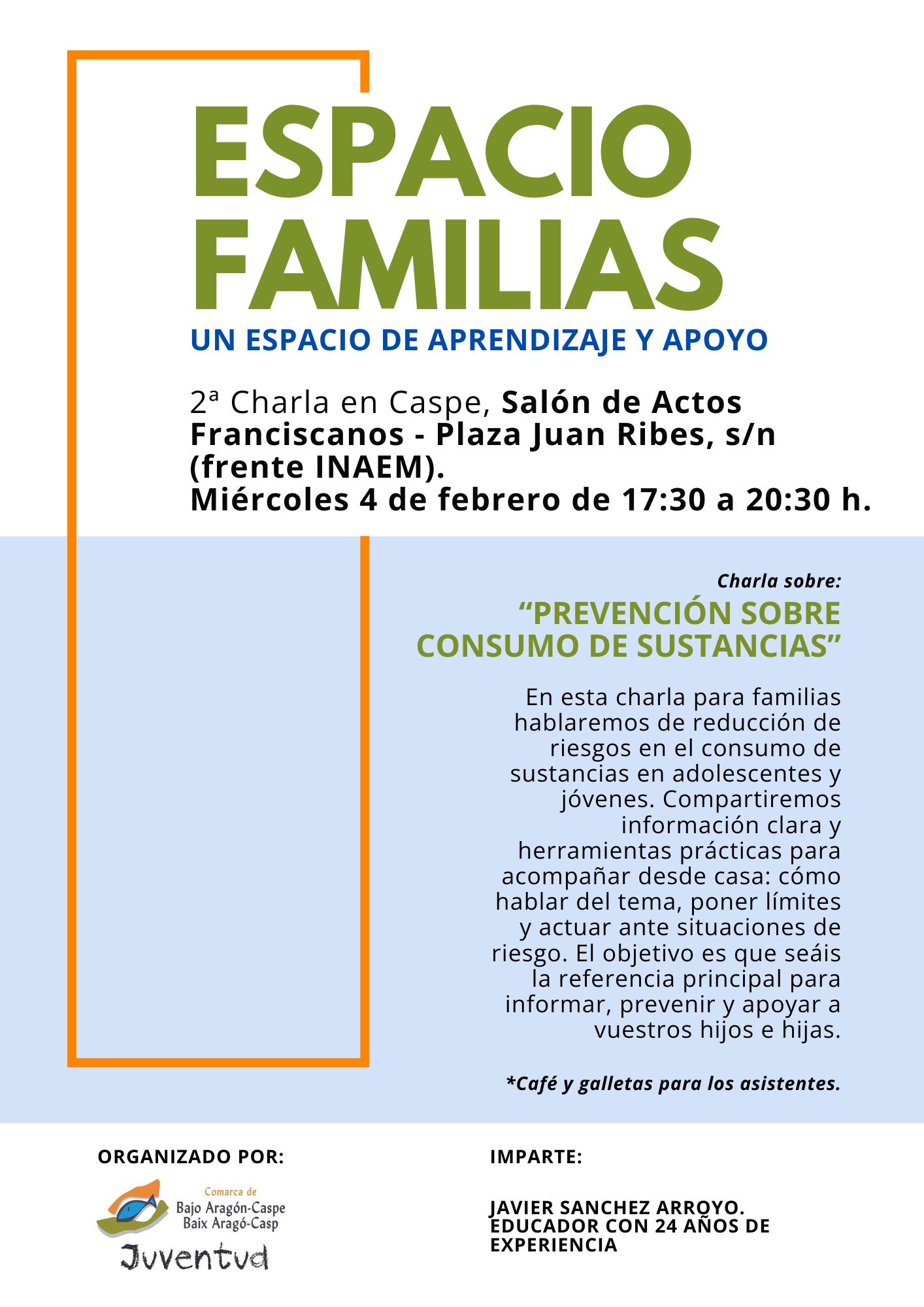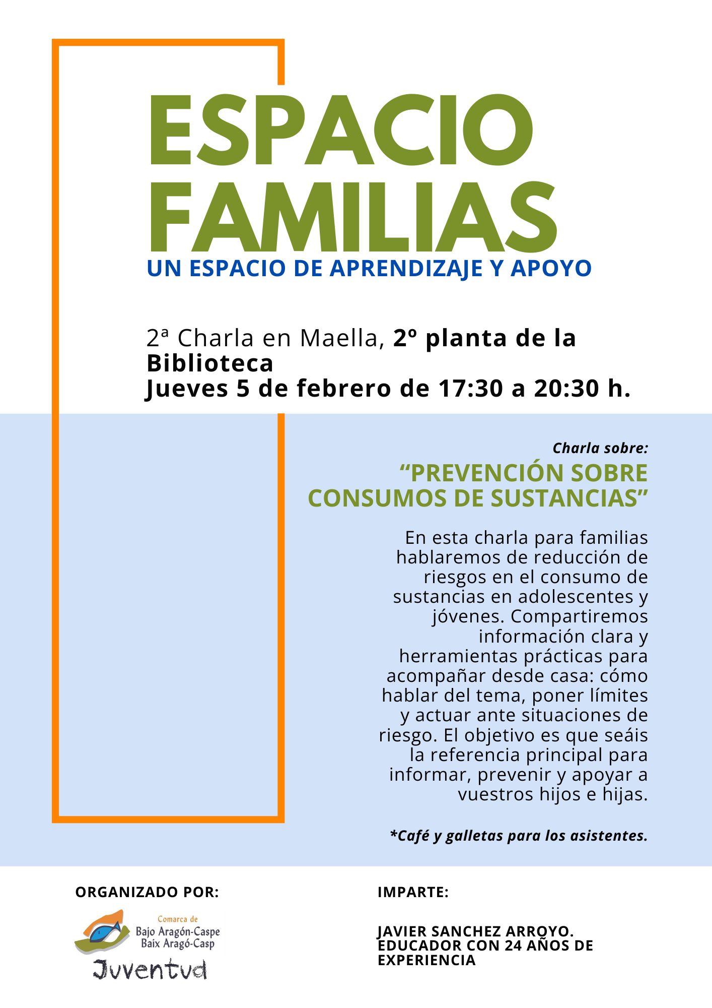 La sesión será impartida por Javier Sánchez Arroyo, educador con 24 años de experiencia. Al finalizar, se ofrecerá un ambiente cercano y distendido con café y galletas para las personas asistentes.
