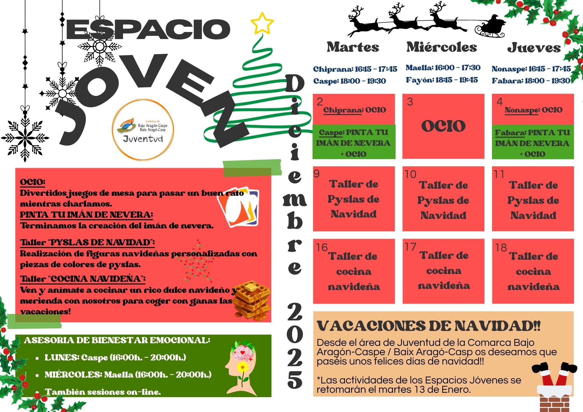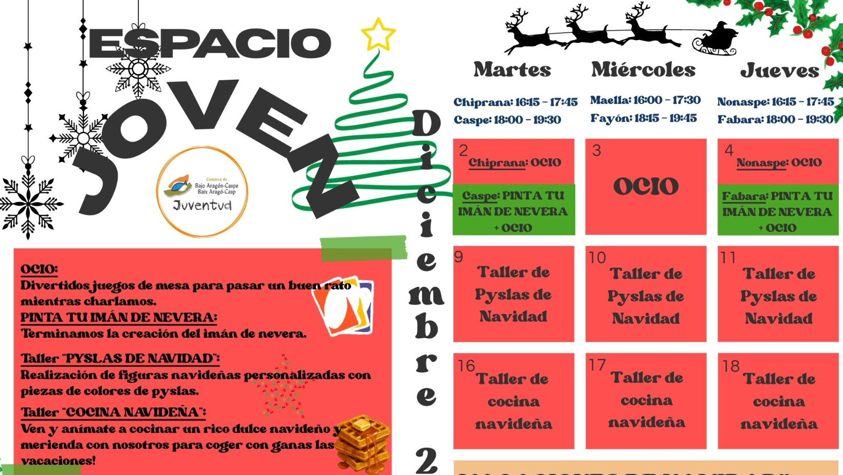 Durante el mes de diciembre los Espacios Jóvenes de la Comarca Bajo Aragón-Caspe / Baix Aragó-Casp continúan abiertos como punto de encuentro para chicos y chicas de la zona.