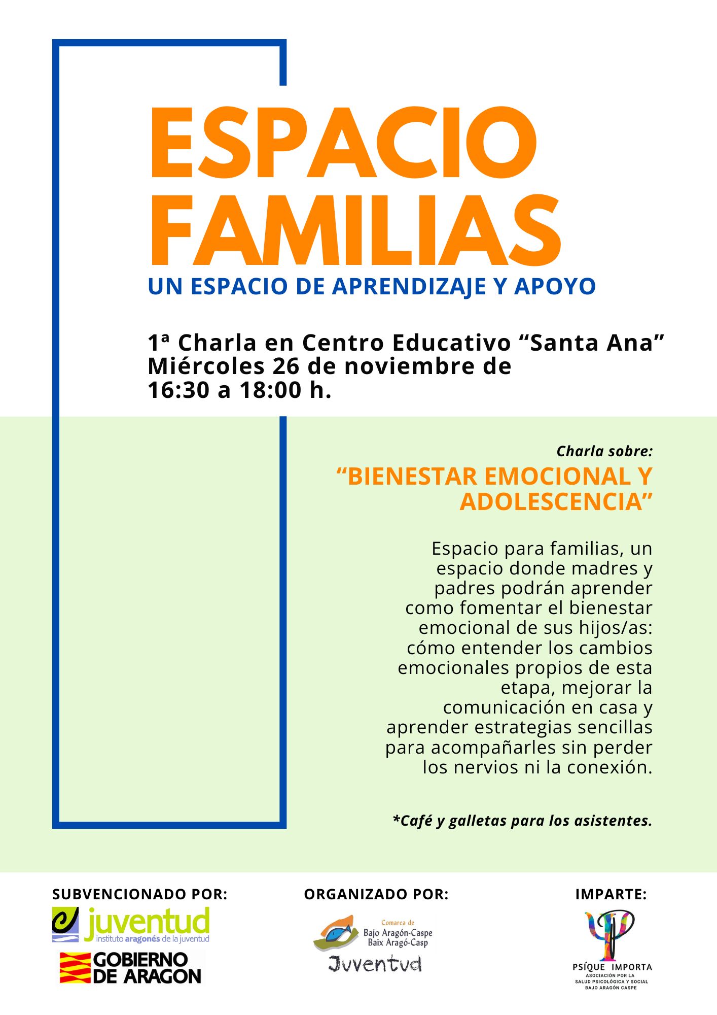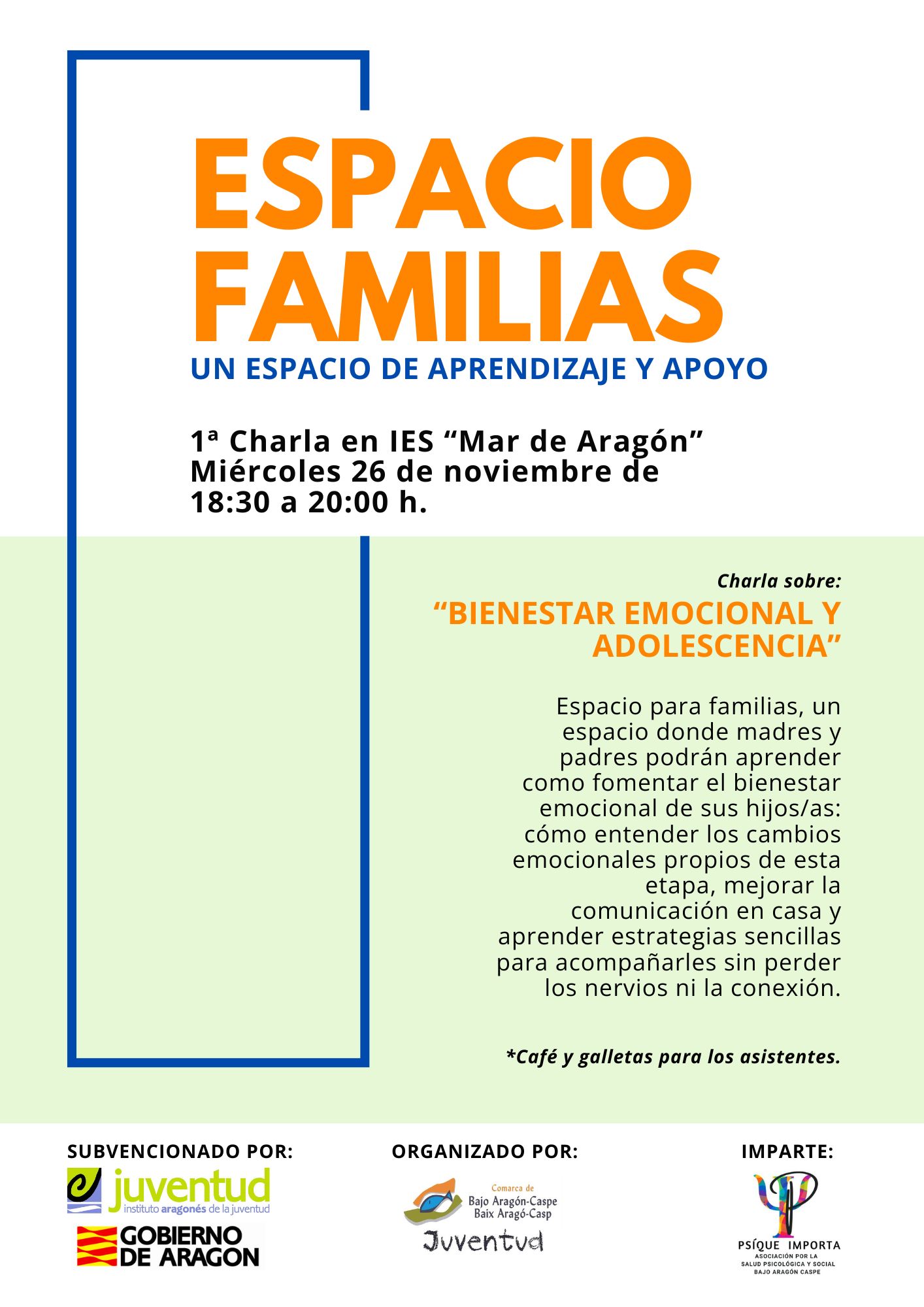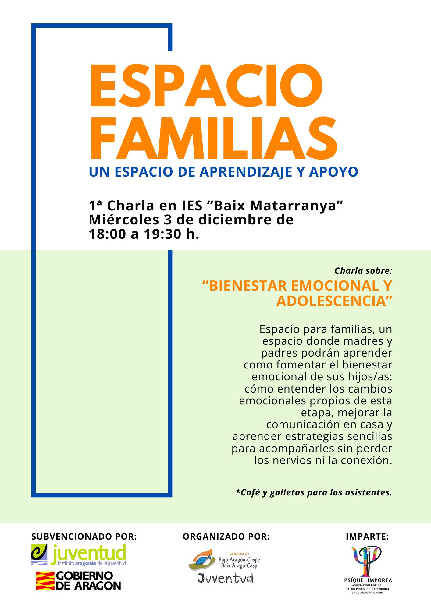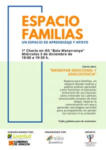 21 Nov “Espacio Familias”: charlas sobre bienestar emocional y adolescencia en la Comarca Bajo Aragón-Caspe / Baix Aragó – Casp