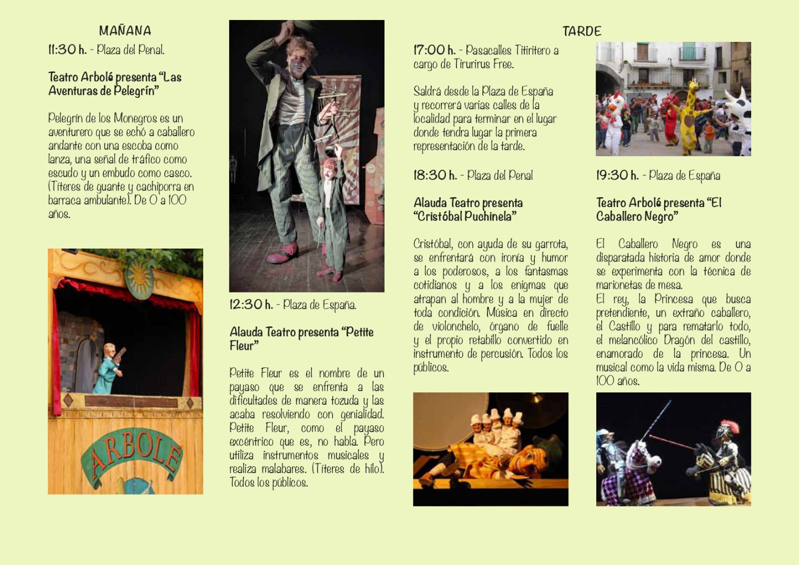 Por la tarde arrancaremos a las 5 de la tarde desde la Plaza de España con un pasacalles titiritero a cargo del grupo Tirurirus Free (que vienen desde Huesca) y todos aquellos que se quieran sumar. Recorreremos varias calles de la localidad alertando de la presencia de los títeres con nuestra música y terminaremos en la Plaza del Penal donde tendrá lugar la primera actuación de la tarde.