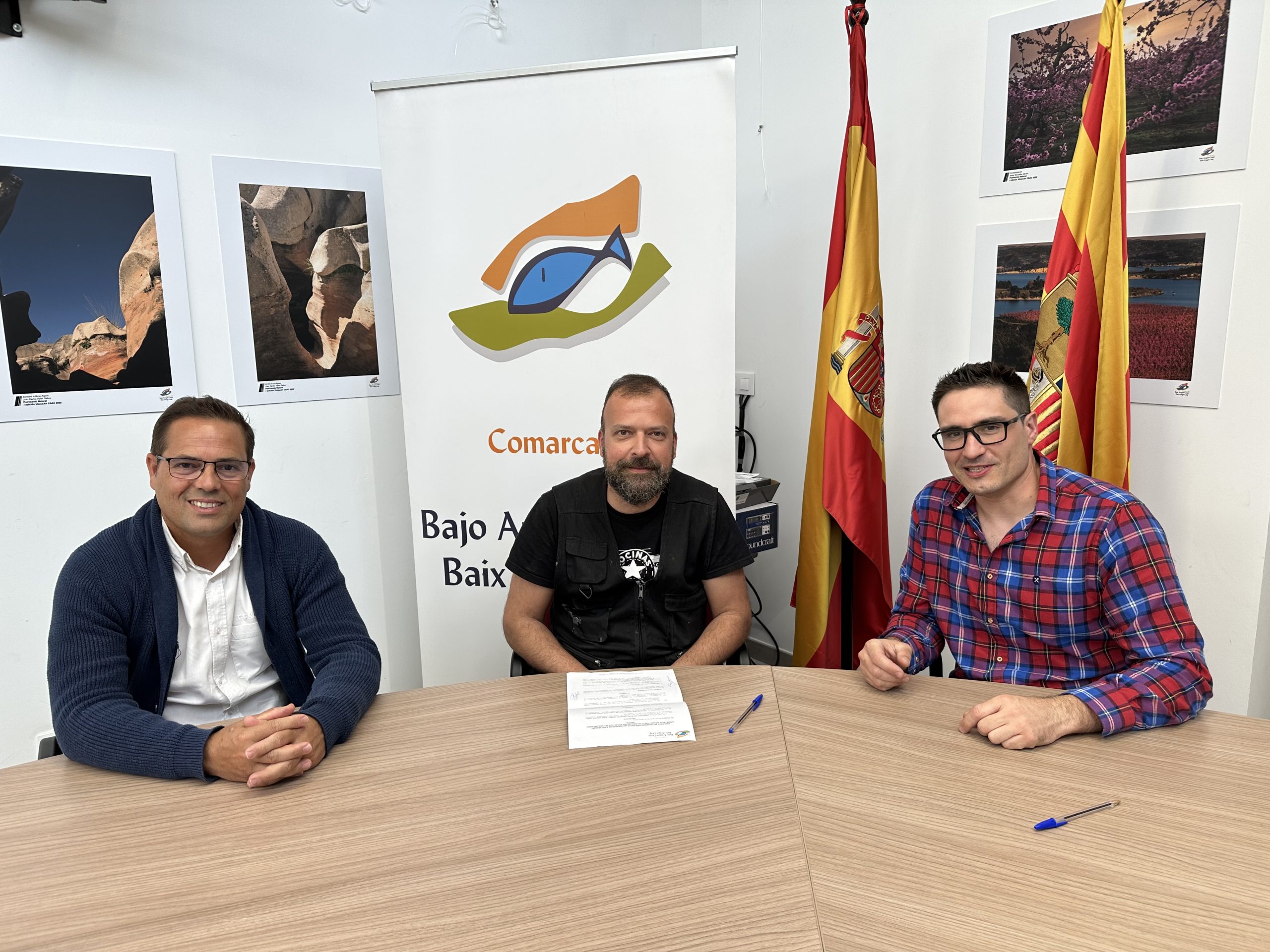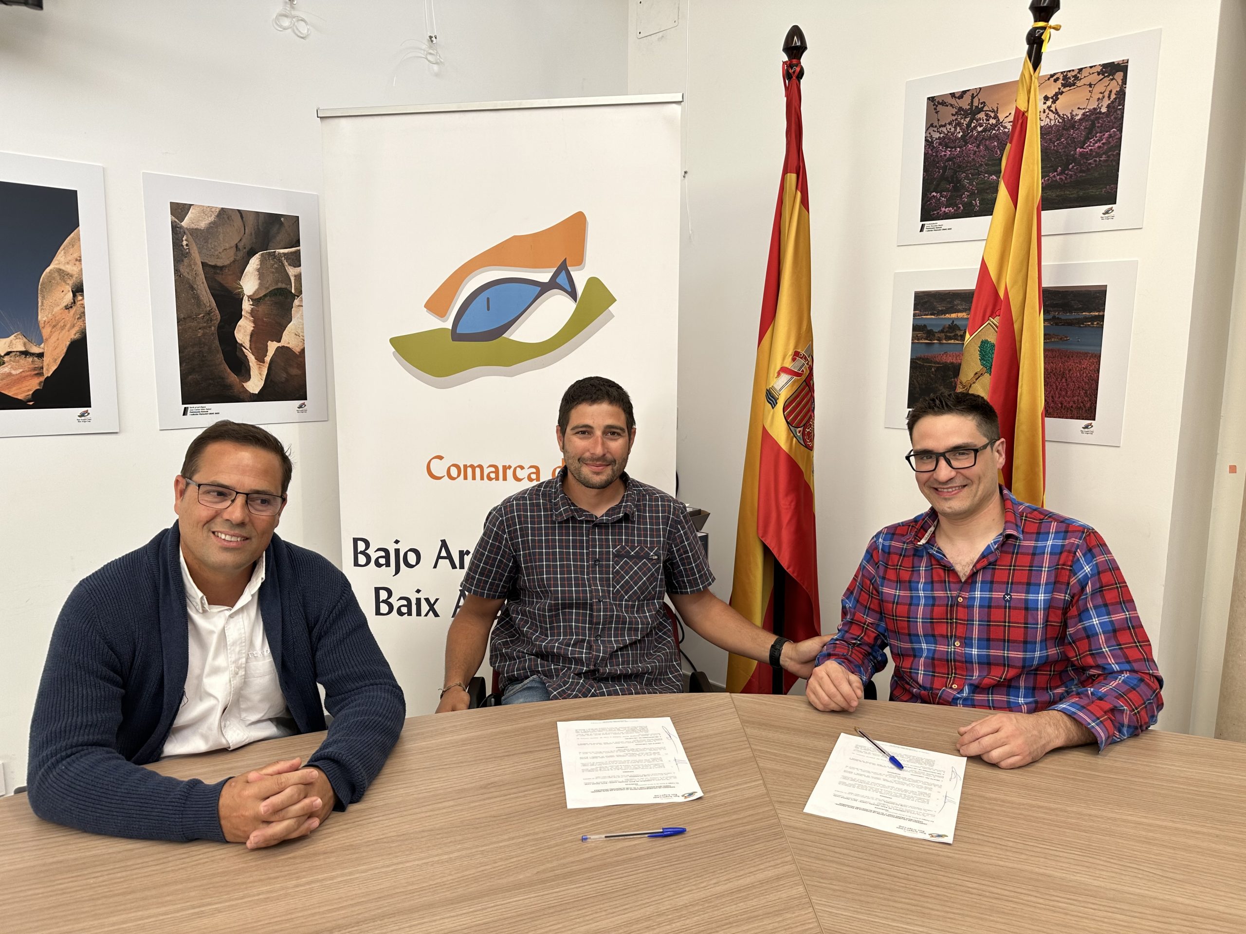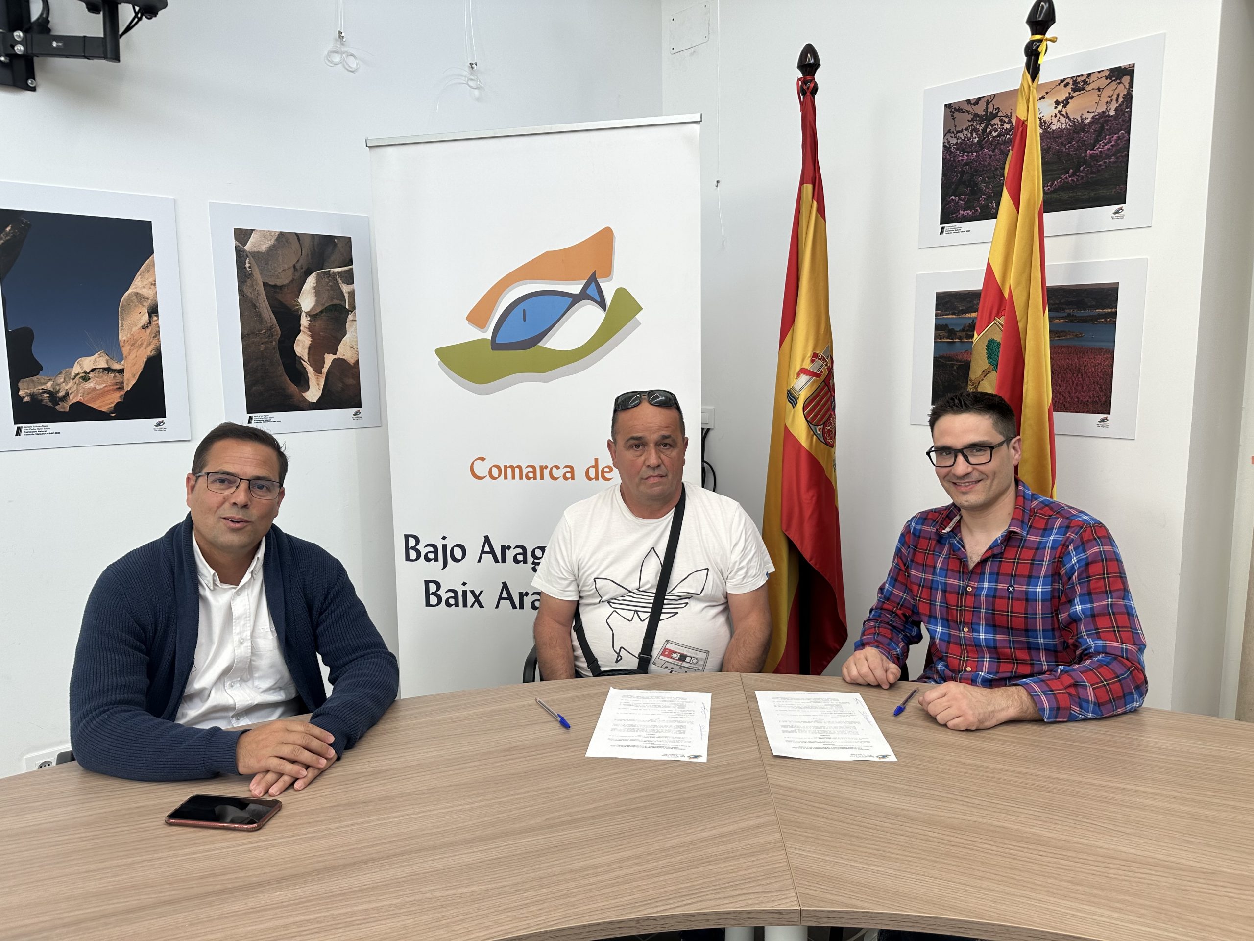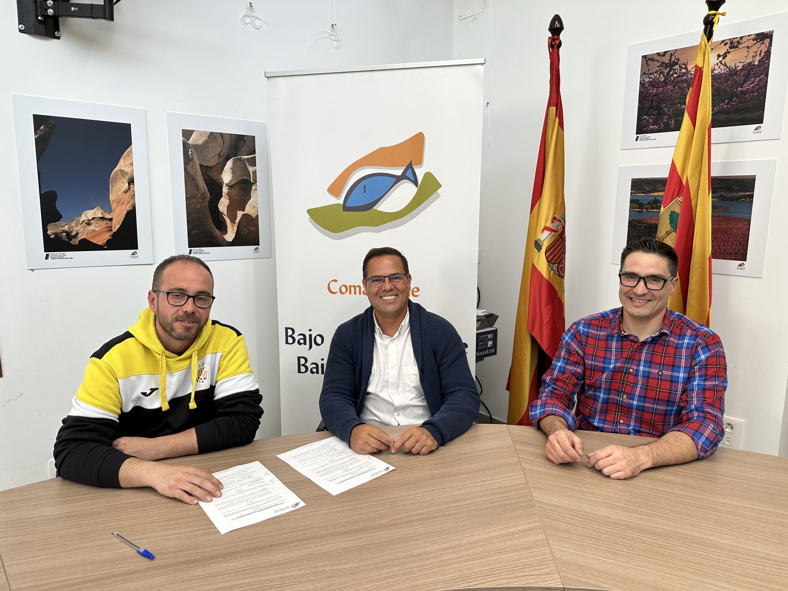 A la firma asisten Cristian Poblador Guardia, presidente de Comarca, Ramón Repollés Lacueva, Consejero del Área de Deportes y los representantes de cada asociación,