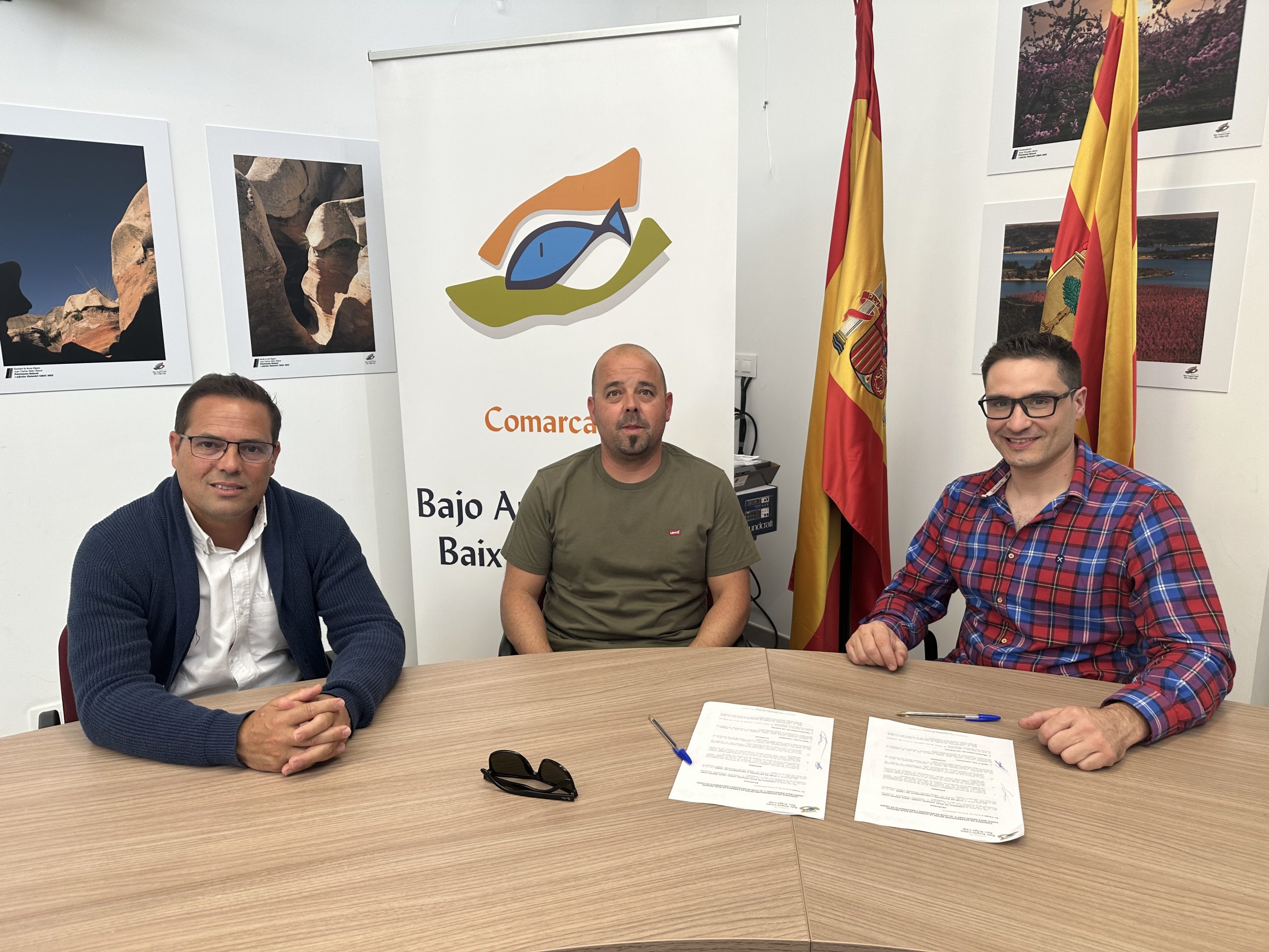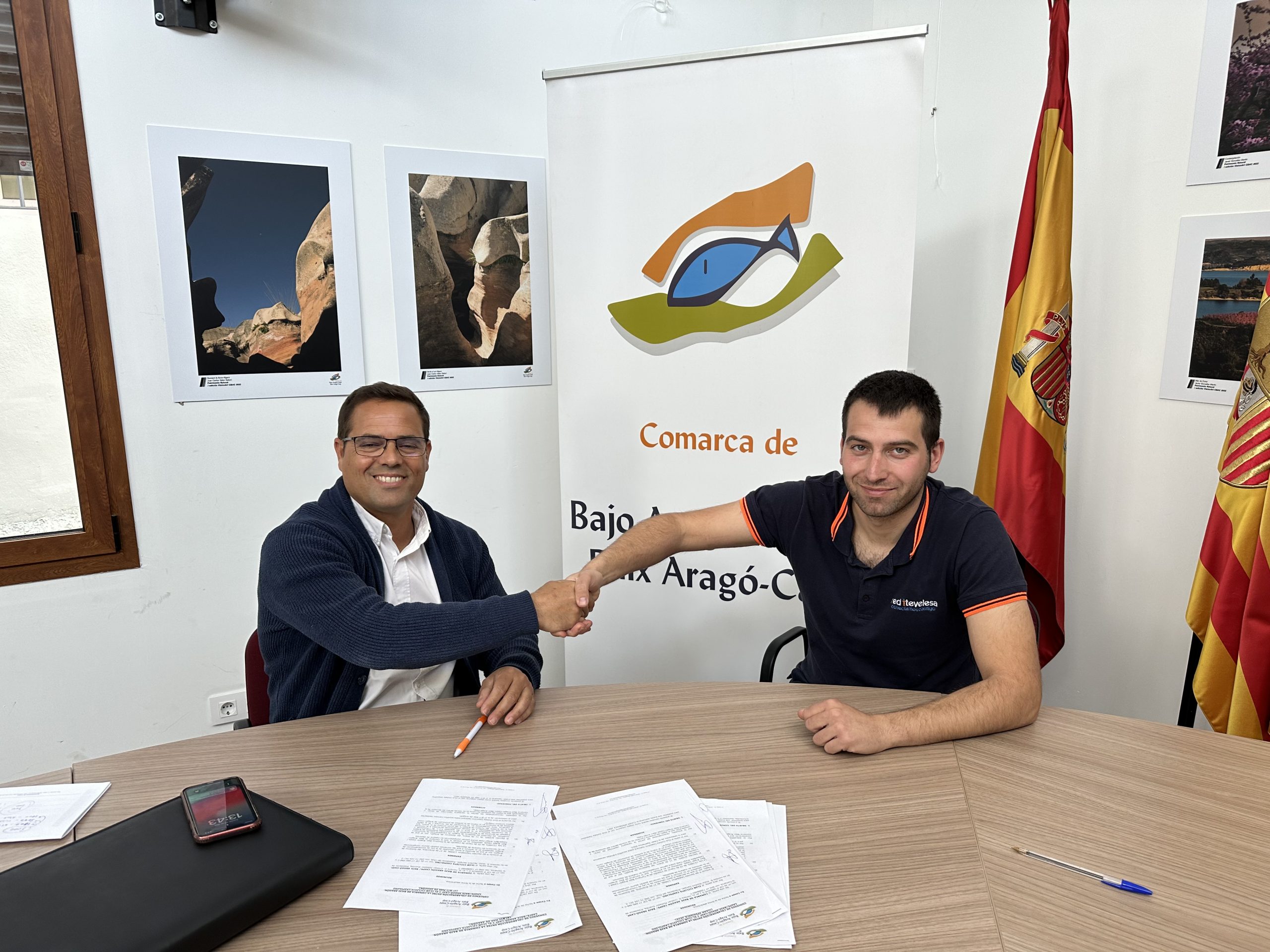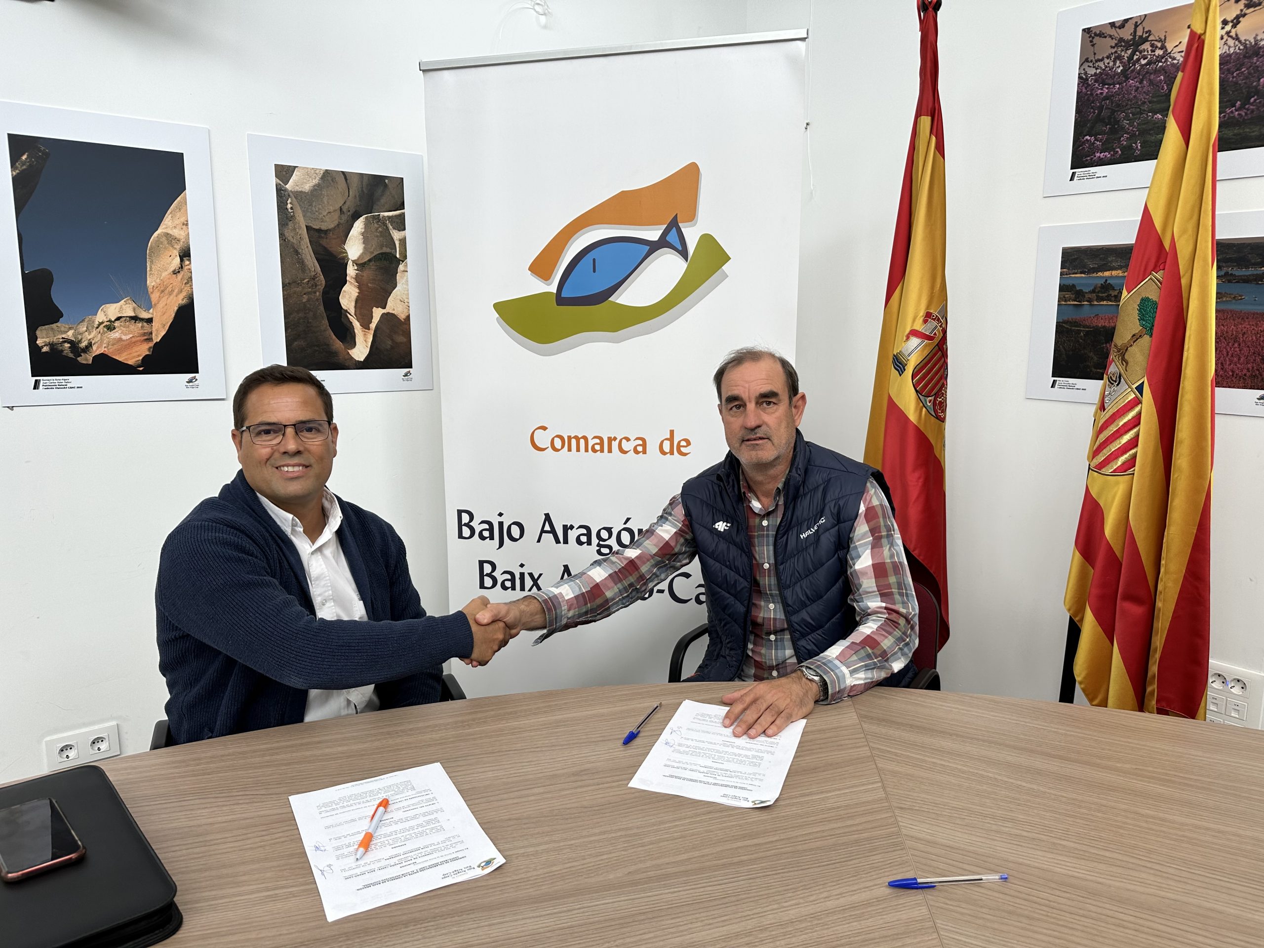 A la firma asisten Cristian Poblador Guardia, presidente de Comarca, Ramón Repollés Lacueva, Consejero del Área de Deportes y los representantes de cada asociación,
