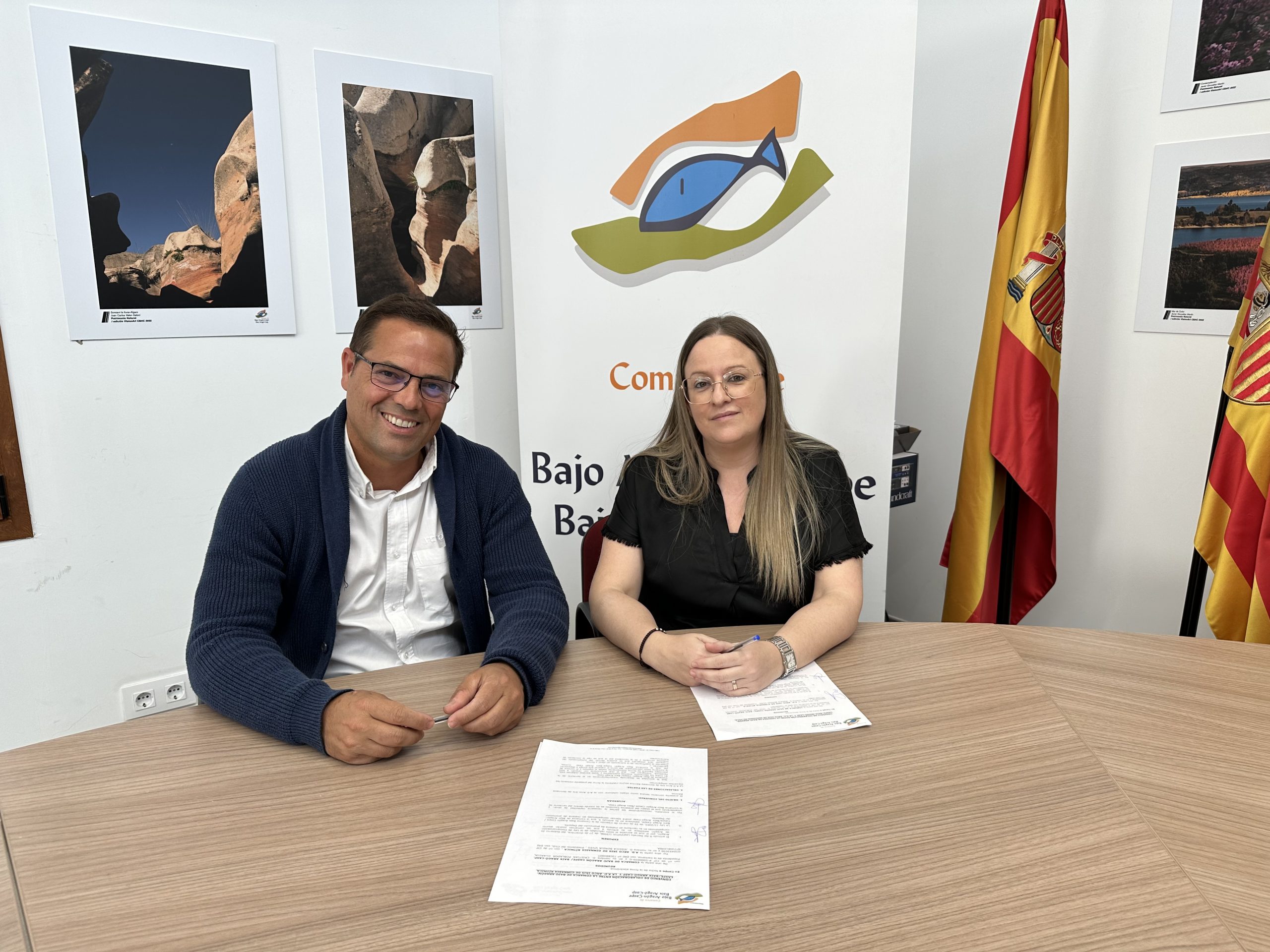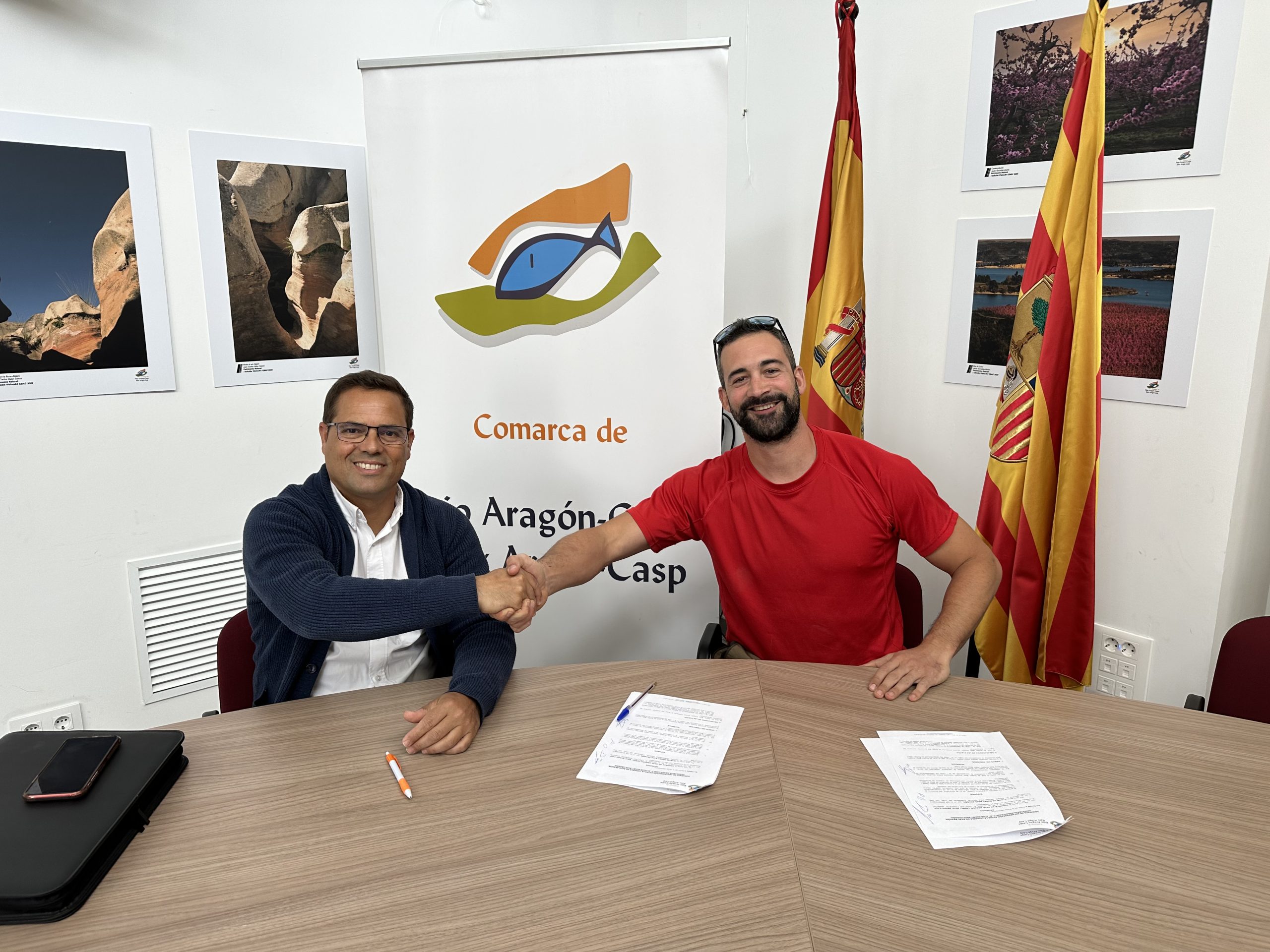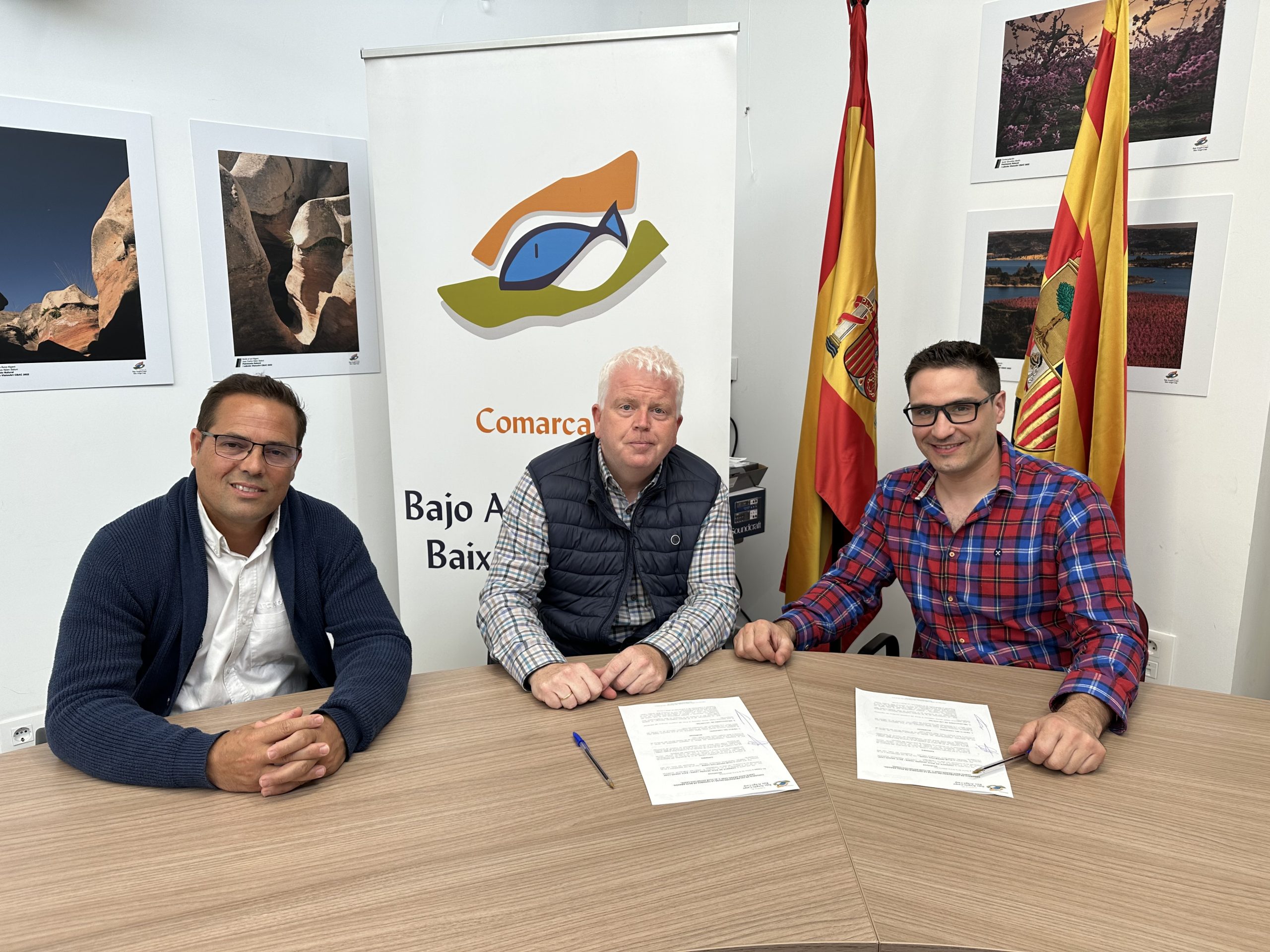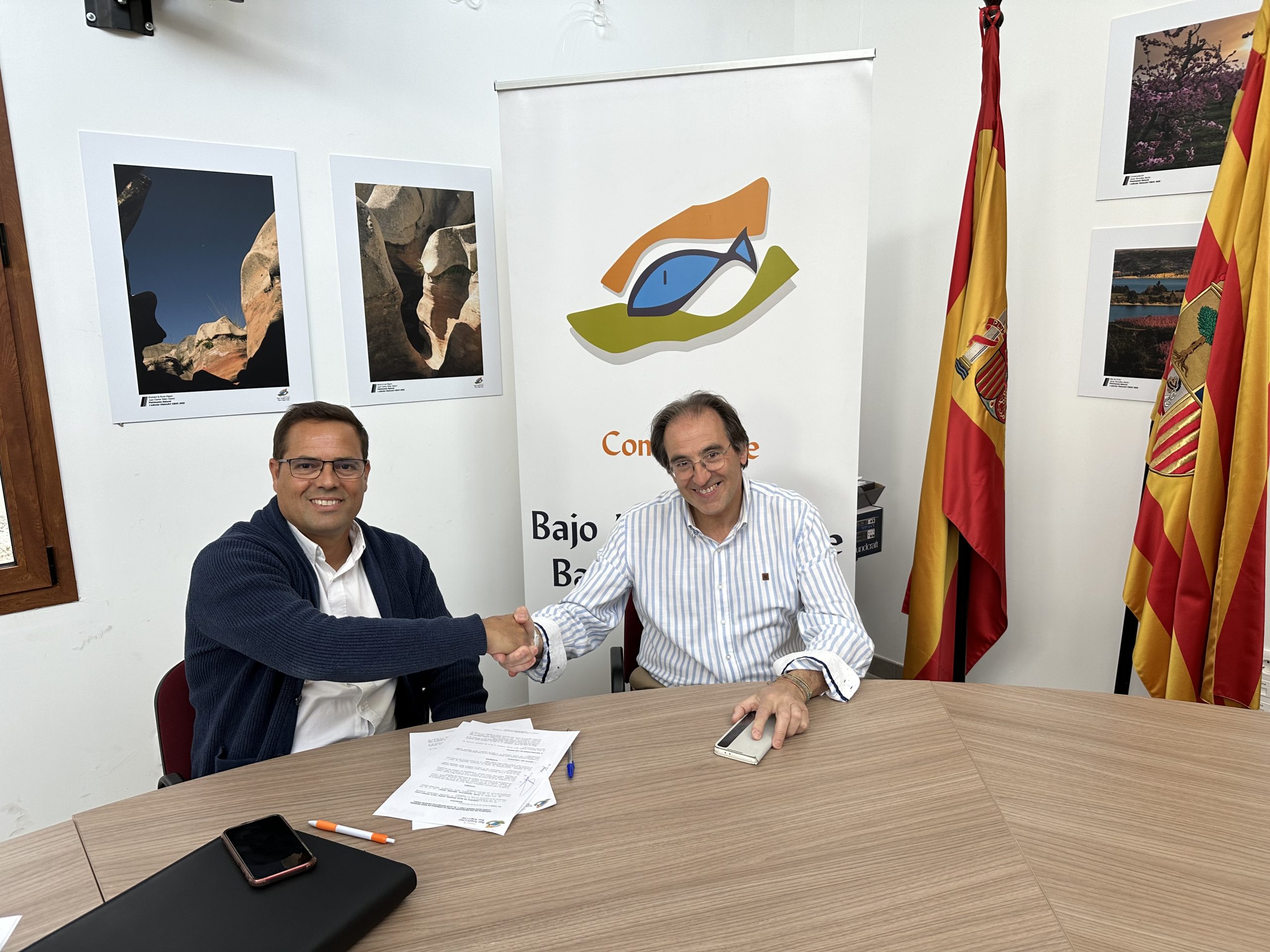 A la firma asisten Cristian Poblador Guardia, presidente de Comarca, Ramón Repollés Lacueva, Consejero del Área de Deportes y los representantes de cada asociación,