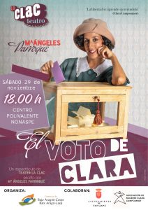 Este monólogo teatral nos acercará a su figura y qué mejor que representarlo en Nonaspe, donde la Asociación de Mujeres de la localidad lleva su nombre: Asociación de Mujeres Clara Campoamor.