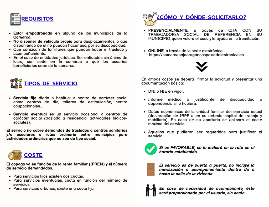 El transporte social adaptado, está planteado con el fin de acompañar a servicios básicos de servicios sociales al usuario, que por edad, enfermedad o situación social no cuentan con medios propios para desplazarse, así como que las personas con que convivan no puedan asumir dicha